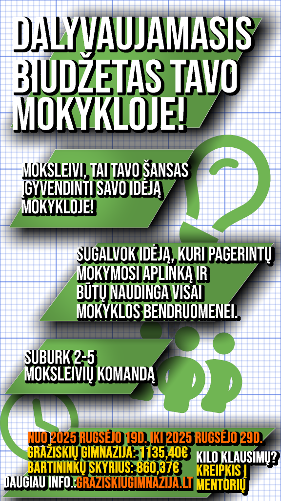 KVIETIMAS TEIKTI IDĖJAS MOKINIŲ DALYVAUJAMOJO BIUDŽETO INICIATYVOS PROJEKTŲ ATRANKOS KONKURSE 2025-09-052025-09-09 graziskiugimnazija.lt KVIETIMAS TEIKTI IDĖJAS MOKINIŲ DALYVAUJAMOJO BIUDŽETO INICIATYVOS PROJEKTŲ ATRANKOS KONKURSE Direktoriaus įsakymas V.M-107 Dėl mokinių dalyvaujamojo biudžeto aprašo tvirtinimo