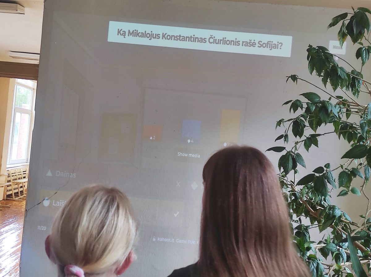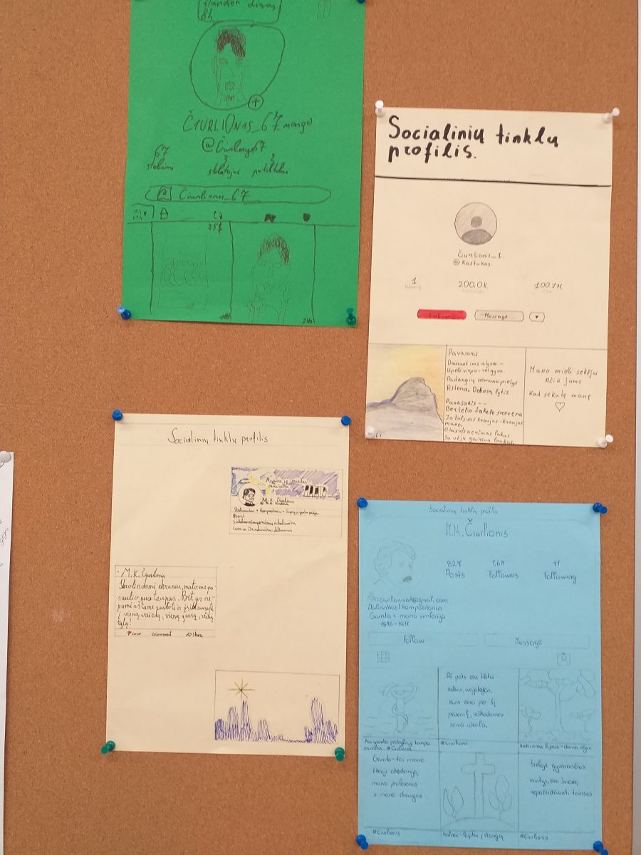 Lietuvių kalbos ir literatūros pamokose mokiniai Čiurlionį pažino ne tik kaip kompozitorių ir dailininką, bet ir kaip poetą, kuris nepaleido iš rankų ir plunksnos, mėgino jėgas literatūroje. Skaitydami M. K. Čiurlionio laiškų mylimai Sofijai ištraukas mokiniai labiau pažino šį menininką kaip žmogų, gebantį šiltai, atvirai, emocionaliai išreikšti savo mintis. I ir II gimnazijos klasių mokiniai užsiėmė ir kūrybine veikla – dirbdami grupėse mąstė, kaip Čiurlionis galėtų save reprezentuoti šiuolaikinėje viešojoje erdvėje kaip socialinių tinklų veikėjas, ir pateikė įdomių profilių. O besiklausant simfoninės poemos „Jūra“ netgi kilo mintis muziką perteikti šokio judesiais. Ir tai įvyko!