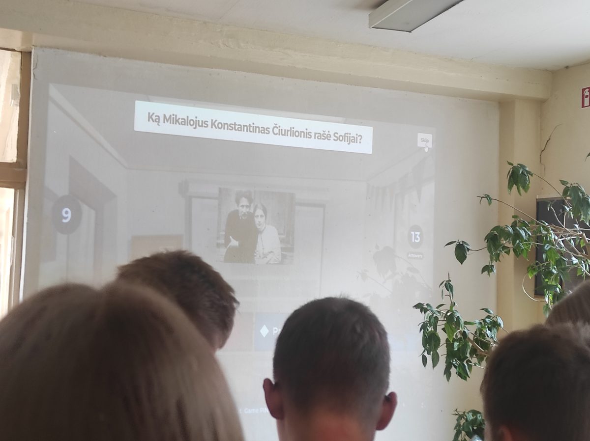 Gimnazijos socialinė pedagogė Romena Balsienė organizavo protmūšį „Čiurlioniui 150“. Jame dalyvavo 5–8 klasių ir I–IV gimnazijos klasių komandos (po penkis mokinius). Čia netrūko emocijų, noro parodyti kuo geresnes žinias ir surinkti kuo daugiau taškų. Labiausiai pasisekė patiems vyriausiems – IV gimnazijos klasės atstovams.