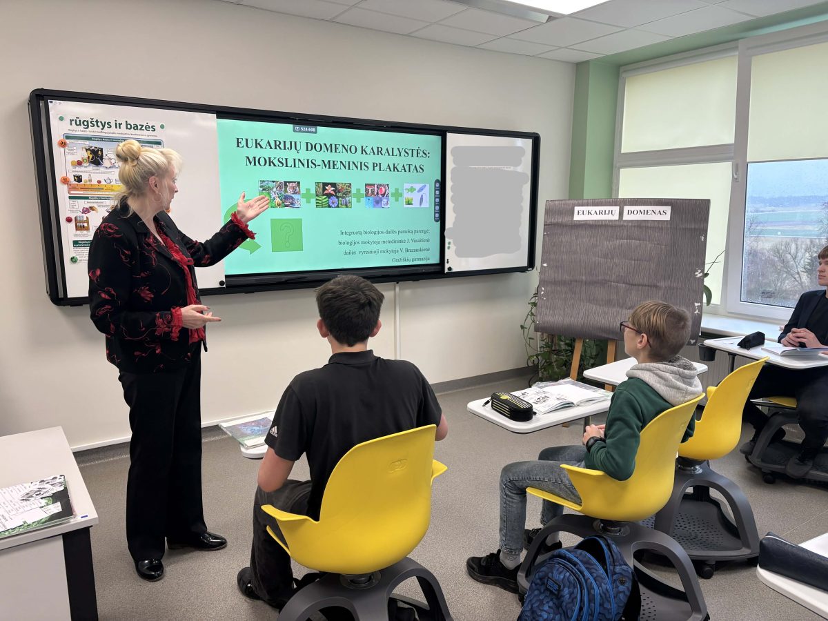 Pamokai „Eukarijų domeno karalystės: mokslinis meninis plakatas“ vadovavo ir užduotis ruošė biologijos mokytoja metodininkė Janina Vasaitienė ir dailės vyresnioji mokytoja Vilma Brazauskienė. Mokiniai susipažino su eukarijų domenui priskiriamomis karalystėmis. Sužinojo, koks požymis jungia jas į vieną domeną. Sužinoję , kaip vizualiai perteikti biologinį turinį naudojant schemas, simbolius, spalvas ir piešinius, septintokai grupėse kūrė plakatus, kuriuos vėliau sujungė į vieną bendrą mokslinį meninį plakatą. Kaip sekėsi, ką išmoko pamokoje, mokiniai pasitikrino plickers kortelėmis, kurios nuskaitomos naudojant „Plickers“ mobiliąją programėlę. Tai paprastas ir įdomus būdas apklausti mokinius.
