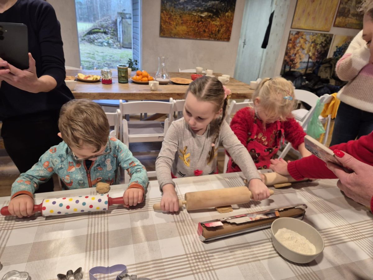 Po aktyvaus pasivaikščiojimo vaikai sušilo vaišindamiesi karšta kakava ir gardžiais blynais, o vėliau patys kibo į darbus – kepė meduolinius sausainius, kurių kvapas pripildė aplinką jaukumo ir artėjančių švenčių nuotaikos.