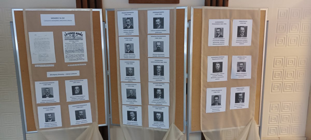 Vyresniųjų klasių moksleiviai parengė stendinį pranešimą apie 20 signatarų, primindami mums, kokios drąsos ir pasiryžimo prireikė atkuriant Lietuvos valstybę.