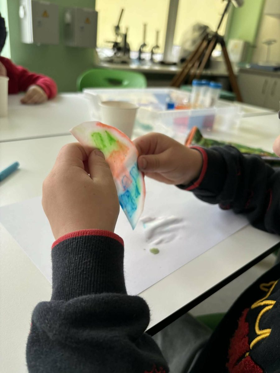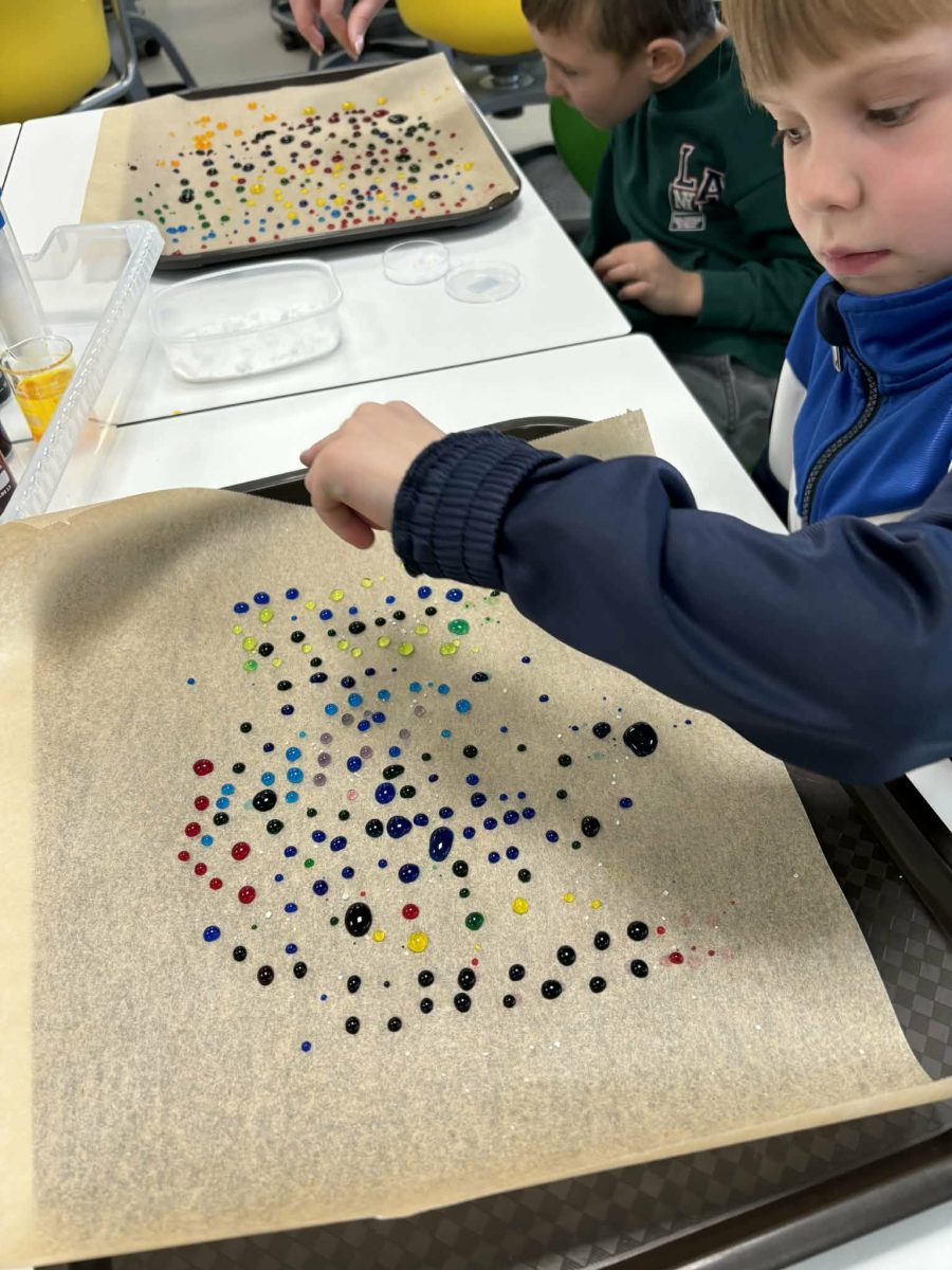 – eksperimentavo su „lietaus lašeliais“ , stebėdami burbuliavimą ir spalvų maišymąsi;